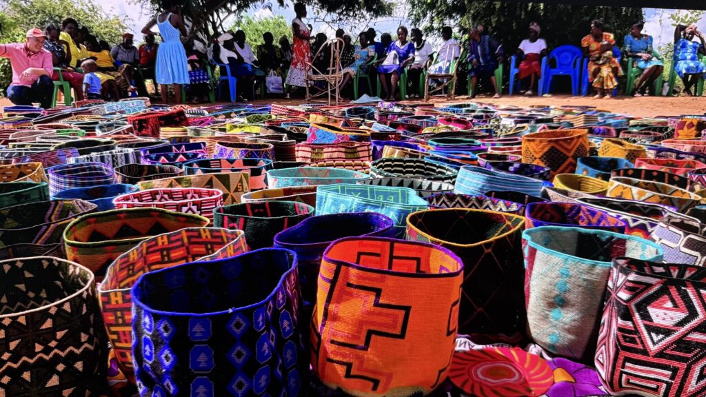 Merry Go Strong was founded by Prof. Sager in 2016 to support this vision. She had observed the hardships of the women in rural Kenya: walking hours to find water, subsistence farming and often abuse in the home. Looking for a new design challenge to help these women Prof. Sager was told by Ms. Kiriga in 2012 about the crocheted baskets made by the older generation who had no education. A Study Abroad program followed: students brought yarn supplies, reading glasses, solar lamps, and eventually grains during times of drought and water tanks to store water. In 2019 photos of the women and their baskets were published by a magazine and the enterprise grew. The women are empowered by the money they are making and violence in the home has gone down. They were able to fix up their houses with roofs, toilets, etc. and they opened shops and a grocery store in the little town. By 2023 the close-knit group of women started wearing matching dresses and called themselves The Basket Ladies. The group has grown from 30 women to over 200. American students still go with Prof. Sager once or twice a year to provide and organize the yarn and crochet hooks and choose the colors. A building is underway to provide permanent workspace and storage areas. The women are paid directly at the time of purchase and receive commissions after the basket is sold, more if the basket is sold for a higher price than expected. After the program many Arts, etc. members purchased most of the baskets brought for display by Prof. Sager.